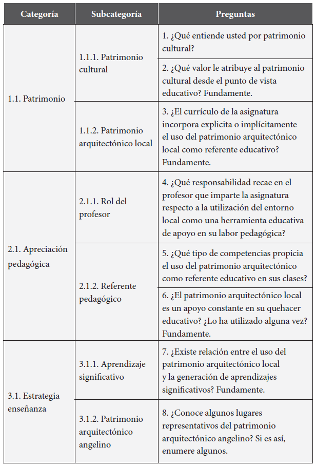 Así mismo, se pudo observar en el profesorado que el concepto de patrimonio lo relacionan perfectamente con los bienes espirituales y materiales muebles o inmuebles que pasan a formar parte de una sociedad que delega a otra sus tradiciones culturales y herencias como puente entre el pasado y el futuro, aproximándose a la visión integradora planteada en este contexto por la Unesco. Principalmente, los profesores advierten que el patrimonio arquitectónico local se materializa en la idea de edificios y conjuntos arquitectónicos pertenecientes a un lugar específico que, por sus valores históricos, culturales y emblemáticos, son significativos para una sociedad en particular. En este sentido, los entrevistados enfatizan que dichos conjuntos arquitectónicos ofrecen múltiples estrategias didácticas para fortalecer los diferentes saberes y conocimientos específicos en el estudiantado, sobre todo cuando se trabaja interdisciplinariamente entre dos o más asignaturas.