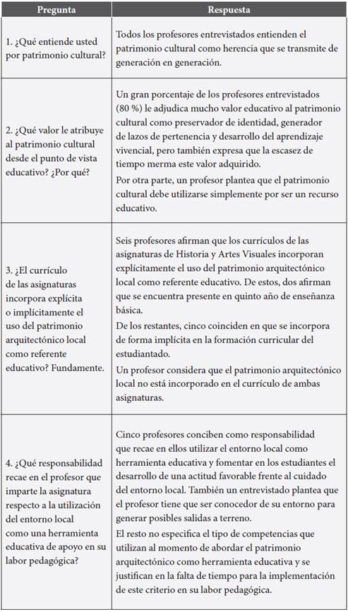 Sin embargo, existen algunas conclusiones a destacar expresadas por el profesorado que imparte docencia en las asignaturas de Historia y Artes Visuales, al asumir una postura favorable al reconocer que el patrimonio cultural local se concibe como una herencia cultural propia del pasado, transmitida de generación en generación y que contiene una enorme importancia educativa asociada con el aprendizaje experiencial, logrando enriquecer la formación general del estudiantado a nivel de la educación básica.