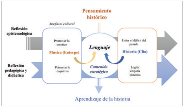 Por esto, la integración efectiva y el tipo de vínculo que se establece entre lo estético, lo didáctico y lo histórico al momento de definir el lugar de la música en el desarrollo escolar de contenidos estratégicos ligados al pensamiento histórico se constituyen en principios fundamentales que deben guiar la planeación y ejecución de prácticas escolares que ven en el establecimiento de este tipo de relaciones pedagógicas la posibilidad de rebatir perspectivas de aprendizaje pasivo de la historia. Para ello, es fundamental entender el papel pedagógico de Euterpe más allá de una función instrumental, problematizándola como un objeto de estudio que, a pesar de tener una identidad propia, posee puntos de contacto significativos con Clío. Esta perspectiva solo es posible materializarla a través de una lectura de la música que aborde diferentes dimensiones de su relación con la historia. Por ejemplo, en el caso específico de las canciones, un posicionamiento pedagógico complejo orientado a la formación de pensamiento histórico debería permitir un triple abordaje analítico: "la historia de la canción, la historia en la canción y la canción en la historia" (Azambuja y Schmidt, 2012, p. 230), claro está, teniendo siempre como eje de articulación el desarrollo de contenidos estratégicos.