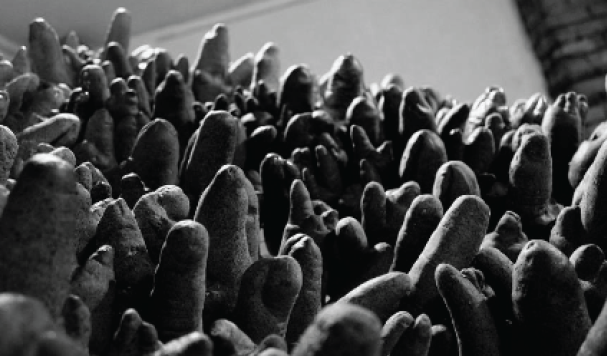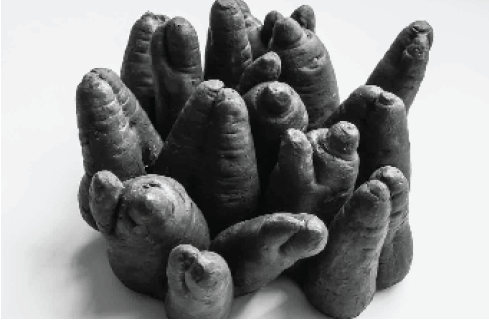 De la pregunta de por qué las botaban surgió un proyecto -Defectus (véase la figura 3)- sobre lo defectuoso, lo diferente, cuyo subtítulo amoide significa las células primarias que empiezan a deformarse y a construir otras cosas. La ceramista ensambló las distintas piezas independientes que reproducen las legumbres rechazadas como formas celulares, las cuales, aunque le parecían muy bellas, seguían siendo las zanahorias deformes y que en la obra adquieren una calidad de piedra, otro material que no fueran cerámica. El contacto con estas raíces la llevó a descubrir que existen muchas leguminosas, frutas y verduras que contienen estas características de deformidad y que siempre son dejadas a un lado, repelidas por no ser del interés del consumidor. No las compran, aunque saben igual, y pueden ser hasta más naturales por no ser afectadas por los pesticidas. Aunque repelidas, las legumbres siguen presentes en la cadena alimenticia, serán consumidas como alimentos por animales herbívoros, los cuales serán consumidos por los carnívoros, y así sucesivamente los cuerpos muertos serán descompuestos por los hongos y bacterias, sus elementos retornaran al suelo, donde serán provecho de plantas, reiniciando el ciclo constante de materia y energía.