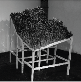 La pieza final -un territorio de zanahoria armado sobre una estructura de madera (véase la figura 4)- es hecha de partes menores, ensambladas en bloque de trece a quince piezas dependiendo de la forma que tengan, organizadas en formas específicas para que se pudiera armar la estructura. No todas las piezas son del mismo color. Estefanía utilizó la base de un engobe café y el otro era un engobe negro, los cuales matizó agregando negro al café y café al negro; unos cuantos fueron coloreados con un azul intenso y vino tinto como elementos de diferentes colores para efectivamente romper con la homogeneidad normalizadora que dio origen a la obra.