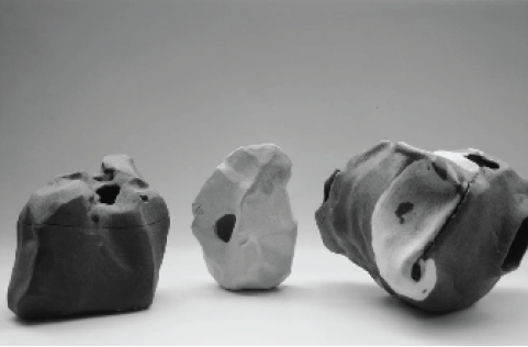 El tacto, sentido fundamental del quehacer de la cerámica, se enuncia en Jacques Derrida5 (2000) como "lo exorbitante, el tacto [tact] 'más allá de lo posible, acariciar, golpear, pensar, pesar: el duelo de Eros y la otra mano de -" (p. 105). Ambas artistas sugieren que este gesto no solo es primordial en la creación, sino transformador del ser que se entrega al tocar. Trabajar con la arcilla es finalmente tocar y la pregunta que nos guía es: ¿este gesto de tocar la tierra también toca a alguien? ¿Debemos, al hablar de la cerámica, ineludiblemente tratar el tocar, la cuestión del tocar? ¿Es este un tema unificador, como propone Derrida? ¿Se puede configurar como una problemática o superar la aporía derridiana?: "Tocar tiene en sí una ley del no tocar" (2000, p. 105), pero, además ¿posee un léxico o una retórica particular? Este problema se difumina en este texto, pero estará presente como propuesta en la obra de Paula Acosta.