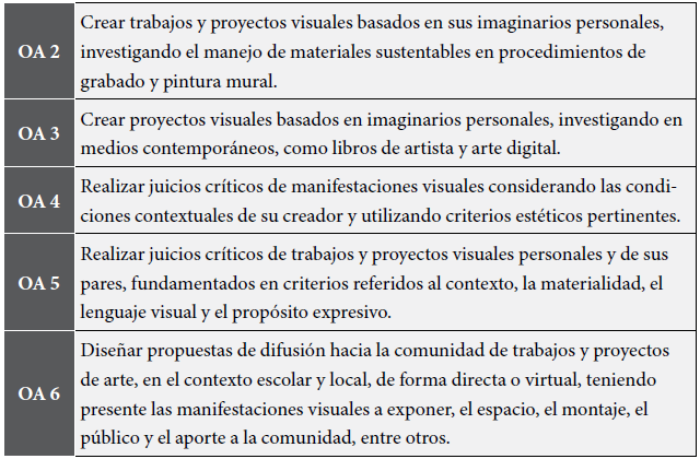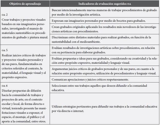 En la tabla 2 se pueden observar los indicadores de evaluación propuestos por el Mineduc que buscan ser abordados desde el grabado. Luego de examinar las bases y el programa se constata que no se encuentra ningún lineamiento sobre la estructura conceptual sustantiva y sintáctica (Schwab, 1964) del grabado: ¿Cuál es la importancia del grabado? ¿Cuáles son aquellas conceptualizaciones sustantivas y asuntos relevantes para la asignatura que se busca que los estudiantes aprendan? ¿De qué manera el grabado, en cuanto lenguaje y técnica para crear y comunicar imágenes, es abordado, contextualizado y adaptado al ámbito escolar? Y, más aún, ¿en qué medida estos componentes, que estructuran un aprendizaje de su aspecto técnico y comunicativo en cuanto sistema de imágenes, se conectan con los entornos culturales cercanos a los estudiantes? Estas preguntas se refieren, sin duda, a las intenciones declaradas o subyacentes de las estrategias posibles a utilizar por los profesores, en las que se encuentran implícitas las acciones que cada grupo de estudiantes desarrollará para dar lugar a un aprendizaje específico.