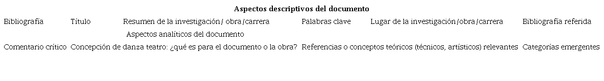 Para realizar la búsqueda de la documentación y su posterior análisis se establecieron los criterios de pertinencia, vigencia de la información, relevancia y tipo de documentos como trabajos de grado, tesis, artículos de revistas indexadas y libros. Se hizo una revisión de programas académicos y se usó como punto de partida la documentación institucional propia. No obstante, la documentación sobre este campo artístico sigue siendo exigua con respecto a su práctica, otro argumento para esta revisión. Se construyó una base de datos para puntualizar las categorías generales de búsqueda y análisis del estado de la cuestión, tal como lo describe la Tabla 1:
