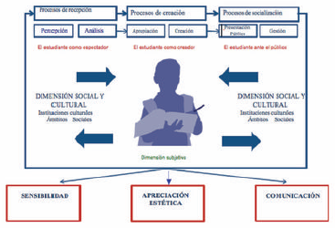 Para el caso de la educación artística -asignatura de obligatorio desarrollo en las instituciones escolares del país-, el currículo se apoya en los Lineamientos de la educación artística y el documento número 16 de orientaciones pedagógicas desarrollado del Ministerio de Educación Nacional, bajo el cual, en el año 2010, se propusieron tres dimensiones que articulan tres procesos fundamentales representados a continuación: