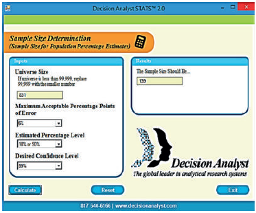 En la investigación cuantitativa es necesario tener claro el nivel de confiabilidad estadístico de la muestra, así como el error máximo que se desea asumir. Para esta investigación se realizó el cálculo de muestra con software decisión Analyst STATS™ 2.0, sugerido por Hernández-Sampieri y Mendoza-Torres (2018).
