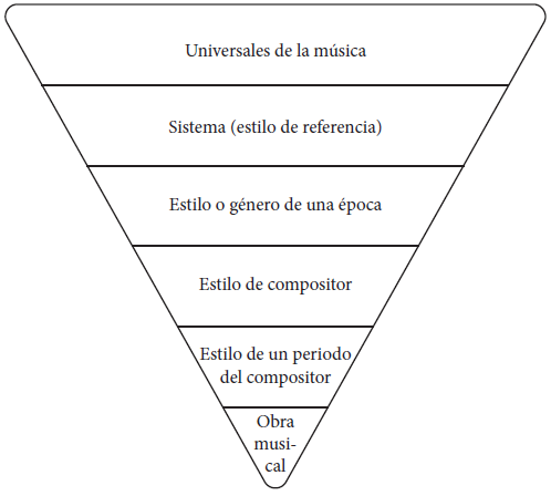 Para hacer un análisis del discurso musical, Nattiez propone una dialéctica que considere desde los signos universales de la música (tono, armonía, melodía, ritmo, etc.); "el sistema" o estilo general musical al que se adscribe la obra; un tercer nivel considera el estilo o género de la época en la que se suscribe la obra para acceder ahora al estilo del compositor e incluso el periodo creativo en el que se contiene la obra hasta finalizar con el proceso de la obra musical en específico. Esta pirámide invertida permite ir de lo general a lo particular en el análisis discursivo de la música, como lo podemos apreciar en la figura 1: