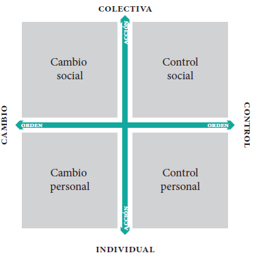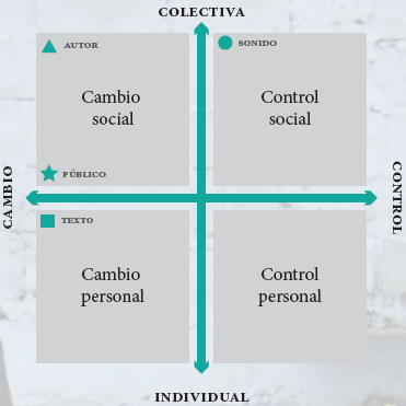 Comenzaré el análisis por el elemento más evidente: las coplas de las canciones. En el eje del control, ambos temas son ubicables del lado izquierdo del esquema, pues su discurso es encaminado hacia el cambio del orden establecido. Donde sí encontramos diferencia es en el eje de acción, pues el tema de Jezzy es mucho más individual que el de Dayra, quien aborda feminicidio, un asunto que implica al colectivo.