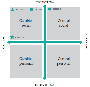 Ahora bien, para hacerlo operativo, el modelo aplica la pirámide de Nattiez, así como los tres niveles de discurso. Estas variables se complementan con una aplicación visual de las ideologías, utilizando un sistema de mapa cartesiano, donde el eje X, encontramos el poder visto como orden, donde a mayor orden encontramos un discurso encaminado al control; en el sentido opuesto del eje, con bajos índices de orden, se tiende al cambio. En lo que respecta al eje Y, ahí localizaremos el nivel de acción del discurso, en donde una mayor capacidad de acción implica un discurso dirigido al colectivo; mientras que en el sentido opuesto, un bajo nivel de capacidad de acción, el discurso apela hacia el individualismo. Con ello se forman cuatro cuadrantes donde se puede ubicar la intención discursiva de un tema musical: