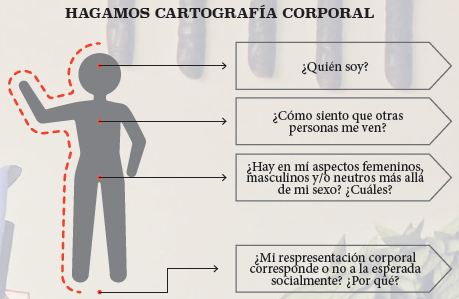A partipdé'esta disrupción en el aula, planteada desde la experiencia disidente, se crea un proceso pedagógico que conduce a la autorrefiexión y a repensar los contenidos de la escuela de género. Para ello, es de gran utilidad plantear talleres, seminarios, cartografías corporales4, entre otras herramientas (En la Gráfica 1 se exhibe una diapositiva diseñada para la realización de una cartografía corporal). En el caso de la Escuela Gimnasio Multicolor, las experiencias compiladas dentro del aula infrecuente proponen apostar por un proceso de exploración polisémica del género, de las relaciones de poder, de la agencia, de la performatividad y de otros elementos asociados con el uso del lenguaje (Ocampo et ál., 2019).