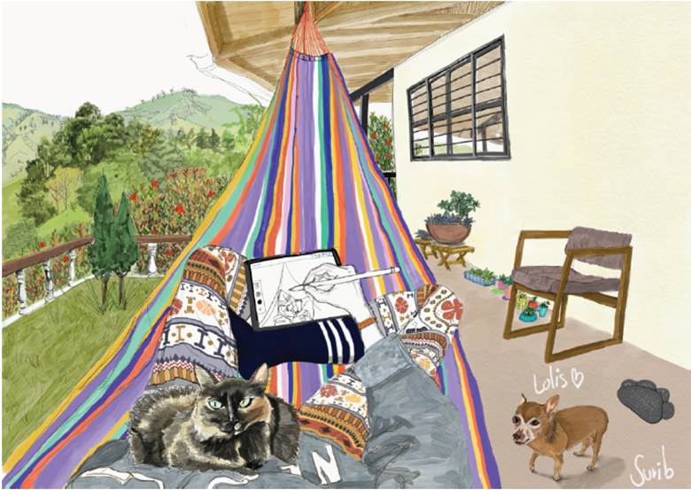 Los criterios de selección de estas aplicaciones iban en relación con las herramientas disponibles en ellas, la experiencia previa de los investigadores con el software, y el acabado final de los ejercicios planteados a mano del curso. La estudiante se dejó guiar por los parámetros de cada ejer cicio, al igual que todos los estudiantes de la asignatura y obtuvo resultados sobresalientes; incluso, por encima de los trabajos elaborados de forma análoga. Por ejemplo, en términos de aplicación de color y entendimiento, produc tividad en la ejecución del dibujo, una sensible atmósfera y ambientación. (Ver figura 5)