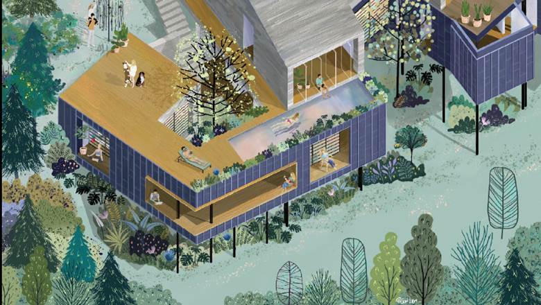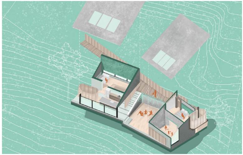 El último escenario es un ejercicio profesional real, donde se conjugan encargos de clientes e investigaciones para lelas de los autores. El primer ejercicio nace de la actividad profesional del coinvestigador Gerardo Abril, quien plantea al equipo: "el proyecto Casa Bosque, en esta etapa de ante proyecto, requiere más que un render para presentar al cliente la esencia del proyecto: su relación con el entorno natural y las posibles actividades exteriores en torno al paisaje". Se exploraron diversas maneras de presentar el proyecto, desde perspectivas, secciones fugadas y vistas aéreas. Al final, se decidió realizar una vista axonométrica de un fragmento de la casa. Aquí se trabajó con un modelo tridimensional en SketchUp, luego una vectorización de las líneas en Illustrator, después se aplicaron las texturas en Procreate y se dibujaron los elementos, escalas humanas y vegetación como si se tratase de una pintura con técnicas mixtas, entre acrílico, óleo y vectores (Ver figura 10).
