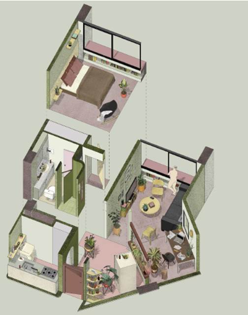 El segundo encargo es una invitación a participar de la investigación personal en curso, Las casas de los otros, que busca establecer un diálogo entre la reflexión espa cial propia de la arquitectura y el espacio habitado desde la experiencia cotidiana, como un retrato de las personas desde el espacio. El resultado es una serie de imágenes las cuales mezclan acabados que simulan técnicas análogas en axonométricos explotados de una calidad visual importante.