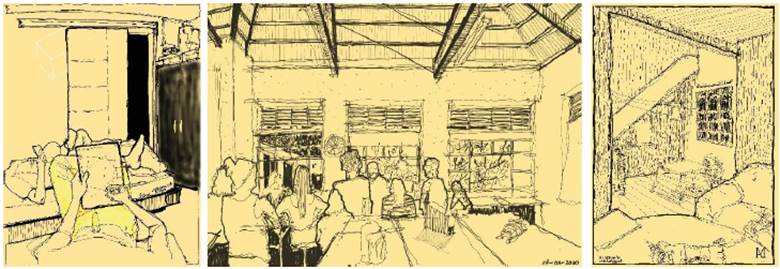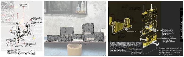 La mayoría de los dibujos realizados por estos estu diantes reflejan un dibujo perceptual, llevaron la tablet a exteriores para realizar bocetos de lo observado o como método de análisis de situaciones cotidianas. Sin embargo, los resultados más interesantes están conectados al dibujo proyectual, o "dibujo de ideación, [...] aquél que se utiliza en la fase de creación del proyecto, y se caracteriza por la espontaneidad, la fluidez y la versatilidad que ofrece en el proceso de diseño del edificio" (Santos Mendoza, 2018) (Ver figura 8).