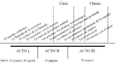 El esquema en cuestión representa el contenido que se desarrolla en cada uno de los tres actos. Además, la obra de Vogler (1992/2007) propone una serie de ejemplos cinematográficos y literarios en los cuales esta estructura se lleva a cabo desde la ficción y desde la cultura en que se ha basado el héroe. Sin embargo, hay casos más complejos, en los que el viaje de cierto héroe no se basa en una cultura específica, sino que toma muchas culturas a nivel mundial, interconectadas cada una por los elementos míticos en común que propone Campbell (1997) para el desarrollo de un viaje del héroe. Es de admirar la capacidad creativa con la que estos guionistas y narradores crean ficción basados en un conoci miento tan amplio como la mitología.