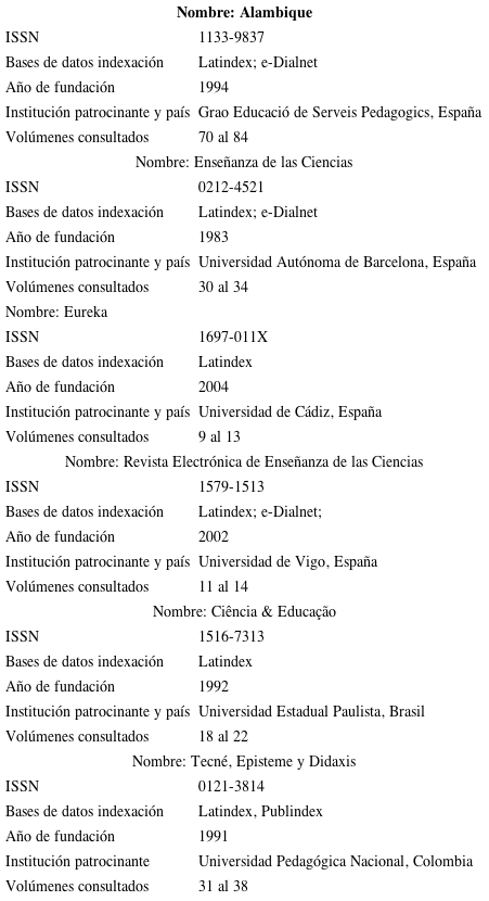 Partiendo de la premisa de que el análisis cienciométrico ha de realizarse con base en información aceptada y avalada por las comunidades científicas (Gallego, 2008), esta investigación con perspectiva histórica de carácter documental (Kragh, 2007) se basó en el criterio de selección de las publicaciones en revistas científicas especializadas en didáctica de las ciencias (Franco y Zúñiga, 2011), ubicando como ámbito de interés el iberoamericano. El criterio consiste en la consulta de los registros en bases de datos internacionales y nacionales (Franco, Gallego Badillo y Pérez, 2009; Franco, Díaz, Gallego Badillo y Pérez, 2011), como se reporta en el anexo I (ficha técnica de datos construida para las revistas seleccionadas). Teniendo en cuenta el estado de la cuestión sobre TPL en la investigación didáctica reportado por Díaz (2012), el periodo tenido en cuenta para la revisión fue el comprendido entre 2012 y 2016.