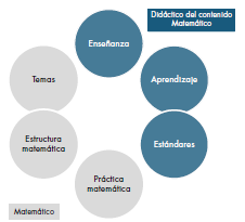 Por el lado del conocimiento didáctico de contenido, el conocimiento de la enseñanza de las matemáticas, entendido como aquel acerca de diferentes estrategias y teorías tanto institucionales como personales de la enseñanza de las matemáticas, en particular herramientas e instrumentos que potencialicen el aprendizaje conectados con la naturaleza de los objetos de estudio; el conocimiento de las características del aprendizaje de las matemáticas que refleja el conocimiento que el profesor tiene acerca de cómo se aprenden los contenidos matemáticos, las formas que los estudiantes interactúan con cada contenido que incluye consideraciones específicas; no obstante, esas consideraciones están vinculadas directamente con el conocimiento de los estándares de aprendizaje de las matemáticas que relaciona los grados de profundidad con los cuales el profesor conoce el currículo oficial y los elementos de reflexión sobre la naturaleza de dicho currículo y las necesidades del contexto.