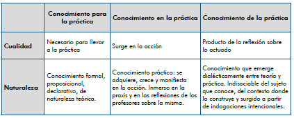 El término conocimiento práctico lo puede limitar a su actividad en el aula de clase obviando elementos que en el desarrollo de la actividad no necesariamente provienen de lo práctico, tal como la teoría o las propias concepciones. El término conocimiento profesional no permite colegir una significación como la que se pretende asignar (Guacaneme, 2013), dado las acepciones que tienen los términos profesional y profesión, aunque se reconoce la intención de llevar al entendimiento de la actividad del profesor como una profesión que va más allá de la condición de oficio, labor técnica o tecnológica, arte, concibiendo al profesor como un profesional y no como un operario, técnico, artista o artesano. Así, el conocimiento requerido para desempeñarse en la profesión docente compila (Eisenberg, 1977) saberes académicos que provienen de diferentes disciplinas que se alimentan por medio de la investigación, se retroalimenta de la reflexión y se condiciona a partir de especificidades sociales, políticas y culturales.