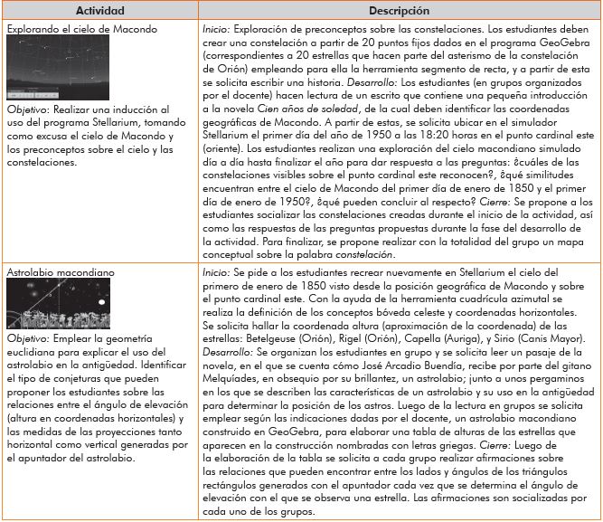 Abstract: This report presents an experience in the interdisciplinary and inter-institutional work that can be achieved through the dissemination and study of Astronomy. The experience is part of the bets on educational research of the interdisciplinary research incubator Paralajes of the School of Education Sciences at Universidad la Gran Colombia, with the participation of students from different undergraduate programs, who, with the help of a group of advisors from the the Bogotá planetarium, aim to disclose how the analysis and reflection on one of the activities that commonly takes place in the planetarium, gave rise to the development of a didactic sequence, which revealed, based on a qualitative descriptive research method, the significant learning of basic concepts of astronomy, as well as mathematical concepts associated with their study. This is based on a careful review and subsequent simulation of the different astronomical events that covered the sky throughout the development of the history of Macondo and the Buendía family in One Hundred Yearsof Solitude, by Gabriel García Márquez. The testing of the sequence took pace in district school Luis Eduardo Mora Osejo, located in the fifth Usme locality, with a focus group of sixth- and tenth-grade students in math class. According to the results obtained, this type of proposal not only captures the interest of students wanting to learn math and other basic sciences, but also abou the universe surrounding them; we also recognized the potential of using programs such as Stellarium and GeoGebra, both in educational research and in the teaching and learning process-in this case, in the teaching of astronomy and math, generating interesting reflections in terms of pedagogical innovation, which deserve to be studied and strengthened.