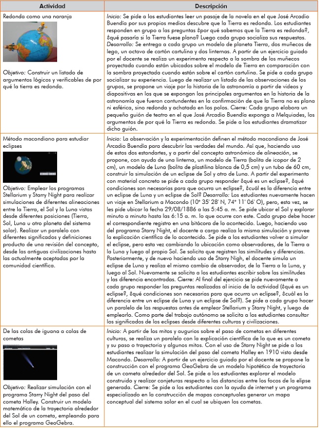 Las anteriores y otras preguntas llevaron a tomar la iniciativa de analizar una de las actividades originada en el planetario durante el año 2015 denominada "El cielo de los Buendía", dicha actividad pretendía establecer la relación entre la literatura y la astronomía mediante la charla interactiva. Asimismo, la iniciativa se propuso rendir homenaje al lugar más emblemático de la literatura: Macondo, pero esta vez tomando como excusa la simulación de los posibles acontecimientos astronómicos que cubrieron la bóveda celeste de Macondo en el desarrollo de la historia de la familia Buendía. Lo anterior, gracias a una minuciosa lectura de la novela Cien años de soledad y a partir del sistema de proyección digital del domo portátil del planetario de Bogotá. Esta actividad se desarrolló en mayo del 2015 en la Universidad La Gran Colombia, en el marco de uno de los eventos organizados por el Centro de Innovación y Talento de la Facultad de Ciencias de la Educación, y en julio del mismo año en el Jardín Botánico de Bogotá, como una de las actividades ofrecidas en el evento denominado Picnic Literario. En ambas actividades y como resultado de la aplicación de encuestas, se evidenció el gusto de los asistentes por actividades de este tipo, así como la capacidad que tiene la astronomía de asombrar y motivar su aprendizaje a todo tipo de público independientemente del campo de estudio al que se pertenezca.
