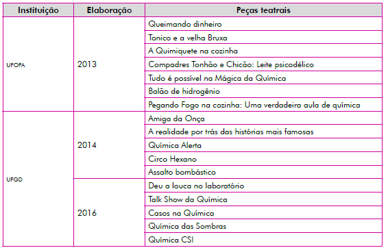 A partir das atividades realizadas pelos grupos de bolsistas, foram constituídas as peças teatrais apresentadas na Tabela 1: