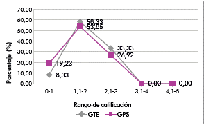 La figura 1 muestra los resultados del test de ideas previas teniendo en cuenta el rango de calificación, la distribución de estudiantes en cada uno de estos rangos y el porcentaje establecido para los dos grupos. Según la gráfica, en el GTE el nivel de logro alcanzado fue un poco mayor que el GPS, con una diferencia considerable en el rango 1,1-2 y 2,1-3, de 4,49% y 6,41% respectivamente. Por tanto, los conocimientos previos de la mayoría de estudiantes de los dos grupos están en la escala no satisfactorio, es decir que la comprensión de los conceptos acerca de los factores que afectan la velocidad de las reacciones químicas y su aplicación en la resolución de problemas es escasa. Por otra parte, se muestra un porcentaje significativo en la escala aceptable, reportando un valor del 33,33% en el GTE y del 26,92% en el GPS, asumiendo que estos estudiantes presentan dificultades para relacionar los conceptos en situaciones problémicas.
