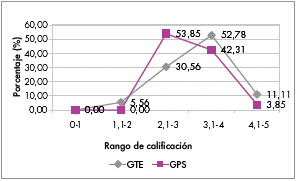 En la figura 2 se observa que para los dos grupos hay un aumento considerable de estudiantes agrupados en los rangos 3,1-4 y 4,1-5, que en los resultados del test de ideas previas no disponía de datos, pues los alumnos se incluían en los niveles inferiores. Sin embargo, para esta prueba, en el GTE el nivel de logro alcanzado es ligeramente superior que el GPS -con una diferencia de 0,3 con respecto a la media-, debido a que se evidencia un menor porcentaje de estudiantes en el rango reprobatorio 2,1-3 y se consigue un mayor incremento en las categorías superiores de aprobación. Por consiguiente, el nivel de conocimiento de la mayoría de estudiantes del GTE (52,78%) está en la escala satisfactoria, es decir que comprenden los conceptos acerca de los factores que afectan la velocidad de las reacciones químicas, pero tienden a confundirse cuando los aplican en un problema; mientras que en el GPS, con un 53,85% se dispone en la escala aceptable, asumiendo que estos estudiantes presentan dificultades para relacionar los conceptos en situaciones problémicas. También es importante considerar el hecho de que en el GPS no hay alumnos en los rangos inferiores, no obstante, en el grupo GTE se dispone de un porcentaje mínimo de 5,56% (dos estudiantes) en el nivel no satisfactorio.