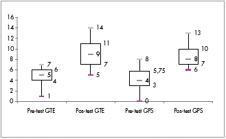 Los diagramas de cajas y bigotes del pretest permiten identificar en forma general dos aspectos importantes para las dos secciones que participan en esta investigación (GTE y GPS). El primer aspecto es que los grupos presentan ideas ingenuas sobre el concepto de cinética química, debido a que ningún estudiante obtuvo un resultado de más del 60% favorable, pues de catorce preguntas el máximo puntaje para el GTE fue de siete respuestas correctas y en el GPS fue de ocho; además, hay estudiantes con puntajes muy bajos, en donde solo se responde correctamente una sola pregunta como es el caso del GTE, e incluso la existencia de un puntaje de cero para un estudiante del otro grupo. Como segundo aspecto se tiene que los grupos son relativamente homogéneos debido a que el rango intercuartílico del GTE es de 2 y el de GPS es de 2,75, sin embargo, en este último grupo hay una dispersión particular en aquellos que están por encima de la media (asimetría = -0,625). Todo lo anterior trae como conclusión que la respectiva estrategia didáctica que se aplica a los dos grupos es pertinente para comparar el grado de eficiencia de cada una de ellas, ya que se parte del hecho de que son grupos similares y con ideas ingenuas sobre el concepto de cinética química; por lo tanto el postest sería un buen indicador para comparar cuál es la versión de la estrategia didáctica que mejor se adapta para el aprendizaje de dichos conceptos.