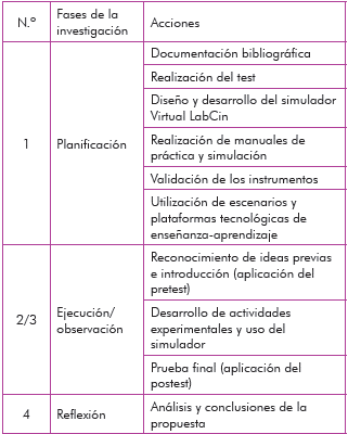 Desarrollo de actividades experimentales y uso del simulador Virtual LabCin: la dinámica de las clases, tanto para el grupo de trabajo experimental como para el grupo en donde se utilizó el simulador, está guiada respectivamente por los cinco manuales de prácticas y de simulación, en donde el docente y los estudiantes siguen cada uno de los pasos (tabla 2) que caracterizan a las clases teóricas demostrativas y las actividades interactivas del aprendizaje activo (adaptado de Sokoloff, 2006, p. 5). Esta guía de acción es un complemento a la metodología establecida en el proyecto "Active Learning in Optics and Photonics-ALOP" patrocinado por la Unesco (Alarcón et al., s. f.).