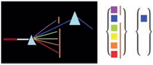 Dado que en la primera actividad se caracteriza el fotón a partir de la cualidad de color, esta permite introducir la noción de estado definiéndolo como las diferentes formas de estar el fotón en relación con la cualidad. La noción de estado se puede evidenciar colocando placas para bloquear los diferentes haces de fotones y permitiendo el paso de solo uno de ellos, por ejemplo, el fotón azul. Seguidamente, el fotón azul es colimado por una rendija y enfocado hacia el segundo prisma, observando que el fotón azul cuando atraviesa el segundo prisma no se descompone en otros fotones como sí lo hace el fotón blanco. Esto evidencia que cada fotón que compone el fotón blanco puede ser considerado un estado bien definido como se muestra en el esquema de la figura 4.