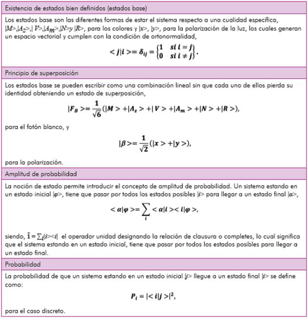 El análisis del efecto y el comportamiento del fotón blanco permite hacer una formalización en torno a lo observado, es decir, a partir del esquema de la figura 2 se puede construir la siguiente representación: fotón morado |M>; fotón azul |Az>; fotón verde |V>; fotón amarillo |Am>; fotón naranja |N>; fotón rojo |R>. A partir de esta representación, el principio de superposición surge naturalmente como la manera de formalizar la relación entre los diferentes fotones, es decir, el estado del fotón blanco |FB> puede ser escrito como una combinación lineal del conjunto de fotones |M>; |Az>; |V>; |Am>; |N>; |R>,