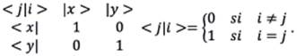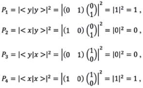 A partir de los estados de polarización bien definidos del fotón se puede introducir el concepto de amplitud de probabilidad. Si un fotón se encuentra en el estado inicial |x> y se quiere saber cuál es la amplitud de probabilidad de que el fotón quede en el estado final |x>, al atravesar el segundo polarizador, se formaliza de la siguiente manera: <x|x>=1. Esta expresión indica que el fotón se encuentra inicialmente en el estado (|x>) y pasa al estado final (<x|). De igual forma, la amplitud de probabilidad para que un fotón estando en el estado inicial |y> quede en el estado final |y> se puede escribir como: <y|y>=1. Además, la amplitud de probabilidad para que un fotón estando en el estado inicial |y> quede en el estado final |x> se puede escribir como: <x|y>=0. Finalmente, la amplitud de probabilidad para que un fotón estando en el estado inicial |x> quede en el estado final |y> se puede escribir como: <y|x>=0. Las anteriores ecuaciones se pueden representar haciendo uso de los siguientes arreglos: