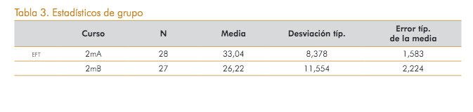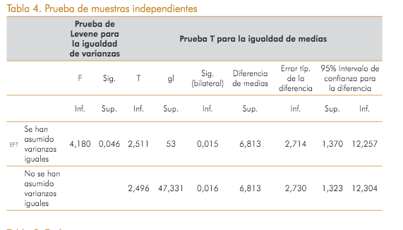En la tabla 3 se observa que el grupo EPC presenta una media más alta que el grupo ABP, y esa diferencia es significativa como se observa en la prueba T para muestras independientes (Tabla 4).