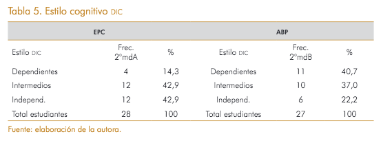 Como se indicó, la clasificación de cada grupo de estilo se estableció mediante terciles del puntaje del EFT. En la tabla 5 se encuentran los resultados obtenidos en la prueba de figuras enmascaradas. Se observa que el grupo de ABP presentó mayor porcentaje de estudiantes con tendencia a la dependencia de campo en comparación con el grupo EPC, que presentó por el contrario un mayor porcentaje de estudiantes independientes de campo.