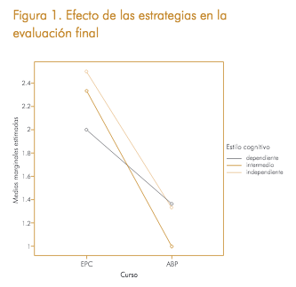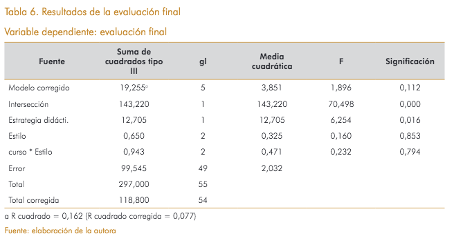 La tabla 6 muestra un efecto significativo de la estrategia didáctica en los resultados de la evaluación final, pero no del estilo cognitivo.