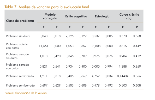 Se realizó un análisis factorial de varianza para cada clase de problema, en el que la variable independiente estuvo constituida por las estrategias didácticas y la variable dependiente fue el logro de aprendizaje en la resolución de problemas y el estilo cognitivo DIC como covariable. Los resultados obtenidos se muestran en la tabla 7.