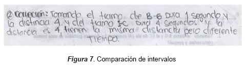El estudiante desarrolla argumentos y herramientas que fortalecen el conocimiento sobre función cuadrática cuando compara intervalos, como se observa en el escrito de la figura 7, referente a la pregunta 2 de la secuencia (1), cuando se les pide comparar tramos del movimiento. Puede verse que toman dos tramos del movimiento y los comparan en forma numérica. Se evidencia que reconocen que para tramos de distancias iguales existen tiempos diferentes, lo cual da bases para pensar que los intervalos ayudan a establecer un modelo gráfico.