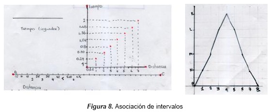 El estudiante establece intervalos, como en el caso del tiempo con otra variable, ya sea distancia o altura, determinando parejas como se observa en las gráficas de la figura (8), donde toma el tiempo y lo une con el valor correspondiente de distancia. Podemos constatar en la primera gráfica de la figura obtenida de la secuencia (1), pregunta 4, que el estudiante reconoce los cambios que sufren las variables de los objetos en movimiento, ya sean cualitativos o cuantitativos, llevando intervalos y puntos de forma unidimensional a bidimensional. En la segunda gráfica correspondiente a la secuencia (2), pregunta 2, el estudiante toma los valores de tiempo al pasar la pelota por los puntos marcados que se encuentran a determinada altura y los traslada a una gráfica, estableciendo puntos bidimensionales en forma numérica y posicional en el gráfico cartesiano, donde se le da significado a un punto tanto por sus coordenadas numéricas como por su posición en el plano. De esta manera el estudiante traslada o extrae puntos del movimiento de la pelota y los localiza en una gráfica cartesiana, para indicar el arriba, el abajo, el más arriba o el más abajo. Las dos gráficas dan cuenta del uso de las gráficas por parte del estudiante trasladando intervalos unidimensionales a dos dimensiones; es un argumento que se desarrolla para resignificar intervalos usando la gráfica. Aquí se hace evidente cómo la práctica de modelación favorece dicho desarrollo y la resignificación correspondiente.