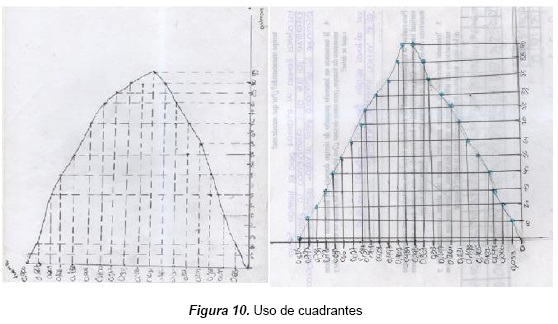 El estudiante usa la gráfica resignificando puntos clave cuando en la figura 9 establece puntos bidimensionales (altura, tiempo) en un plano cartesiano. Podemos ver que las líneas punteadas o continuas asocian cada punto con un valor en el tiempo (eje X) y uno en la distancia (eje Y). En esta doble asociación está trabajando con puntos coordenados. En la primera gráfica de la figura 9 podemos ver que los valores de la variable dependiente no están dados en forma proporcional ni secuencial, pero el tiempo sí. En la segunda gráfica de la figura 9 vemos que el estudiante pareciera estar trabajando en lo que institucionalmente se conoce como el segundo cuadrante. Sin embargo, no es así porque los valores del eje X no son negativos; entonces podemos decir que el estudiante indiferentemente toma para graficar cualquier cuadrante, mostrando que su único interés es realizar la gráfica. La primera gráfica está tomada de la secuencia (1), pregunta 7, y la segunda de la secuencia (2), pregunta 6.