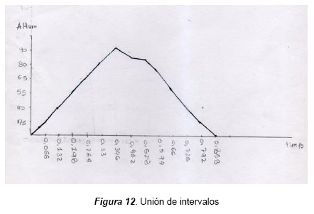El estudiante establece un tiempo medio, en el cual sucede el regreso del objeto y, usándolo como referencia, puede obtener intervalos de distancia o altura. Al hacerlo, el estudiante reconoce que no todas las variables de los fenómenos se representan como modelos lineales, según se observa en la gráfica de la figura 12, tomada de la secuencia (2) pregunta 6, al evidenciar que uniendo intervalos se forma una curva.