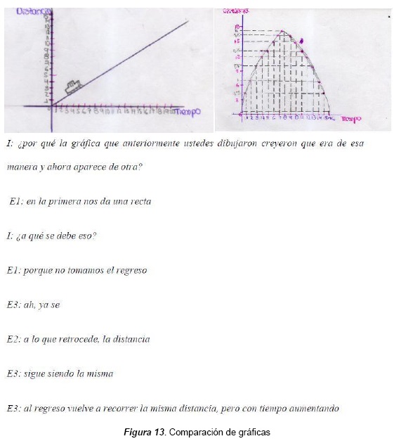 El estudiante cuando compara las gráficas reconoce que los puntos clave lo ayudan a romper con la linealidad en los fenómenos que se presentan, y que no todos los fenómenos tienen comportamiento lineal. Esto se puede observar en las gráficas de la figura 13, donde el estudiante compara las gráficas y se da cuenta de que en la primera no toma el movimiento de regreso. En la segunda, la posición de los puntos le da la forma de la gráfica cartesiana del fenómeno de movimiento. En el diálogo presentado en la figura 13 se plasma la respuesta de por qué las gráficas realizadas por ellos antes y después de la toma de datos son diferentes. La primera hace referencia a la secuencia (1), pregunta 4, y la segunda corresponde a la pregunta 7 de la misma secuencia.