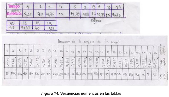 Las tablas sirven de organizador de los datos numéricos para llevarlos a la gráfica; pero también dan indicios del tipo de proporcionalidad que puede existir entre las variables participantes, tiempo y distancia o altura, así como del comportamiento curvo del fenómeno. En la figura 14, a partir de un valor establecido de tiempo se determina un valor para la distancia o la altura. Estas son un punto de unión entre el fenómeno real y el esbozo de una gráfica, porque los datos de las variables se organizan en tablas que facilitan el dibujo de la gráfica. El uso de secuencias numéricas permitió a los estudiantes ordenar los datos y observar su relevancia en la graficación, así pudieron establecer una relación de fenómeno-sucesiones numéricas y sucesiones numéricas-gráfica. Las tablas son un punto de unión entre el fenómeno real y el esbozo de una gráfica porque, de acuerdo al desarrollo de la actividad, el estudiante toma directamente los datos recopilados en las tablas para realizar el esbozo de las gráficas cartesianas. Las tablas les permiten ordenar datos y observar su relevancia en la graficación, así como establecer una relación sucesiones numéricas-gráfica y fenómeno-sucesiones numéricas.