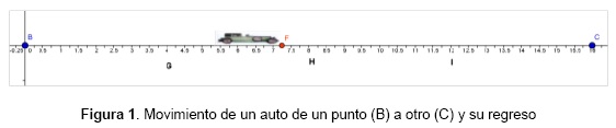 La actividad se basa en el estudio del desplazamiento que sufre un automóvil de un punto determinado a otro. Su propósito es que el estudiante analice el movimiento de un objeto para que busque y encuentre las diferentes relaciones entre lo que ve y piensa y las plasme en el desarrollo de las preguntas propuestas. El auto parte del punto B y avanza hacia la derecha pasando por los puntos G, H, I; disminuye progresivamente la velocidad hasta detenerse en el punto C; luego regresa al sitio de partida aumentando progresivamente su velocidad hasta obtener la misma velocidad con la que partió y pasando por los mismos puntos. El fenómeno propuesto del movimiento se simula a través del software de GeoGebra como se muestra en la figura 1.