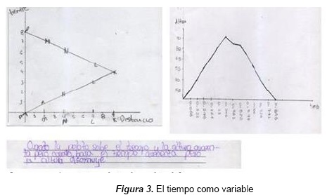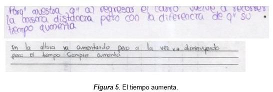 A través de la modelación se quiere relacionar el conocimiento científico (trayectoria que realiza un fenómeno determinado) con el conocimiento escolar (el tiempo como variable independiente, lo que se aprende institucionalmente). Se estableció que la mayoría de los estudiantes reconocen que el tiempo es una magnitud que siempre es positiva y no tiene regreso, siempre va aumentado, como se muestra en las dos gráficas de la figura 3, que corresponden, respectivamente, a las preguntas 2 y 6 de la secuencia 2. En la respuesta de la pregunta 5 de esta misma secuencia, como se muestra en el escrito dado por el estudiante en la figura 3, toman el tiempo como algo progresivo mientras la otra variable puede aumentar o disminuir. Algunos al graficar no sitúan el tiempo en el eje horizontal, como se observa en la primera gráfica de la figura 3, pues no es relevante el establecer la variable el tiempo en el eje horizontal. Generalmente reconocen el tiempo como variable en todas las preguntas de las secuencias que hacían alusión al tiempo dándole un significado. Aunque es una convención situar el tiempo, variable independiente, en el eje horizontal, por ahora parece que se han puesto en juego significados más reales para el estudiante. A través del análisis del tiempo se puede establecer que los estudiantes con sus acciones reconocen un antes y un después. Lo anterior se observa en las dos gráficas, donde el estudiante determina un tiempo localizando un punto que establece la ida y el regreso o un subir o bajar.