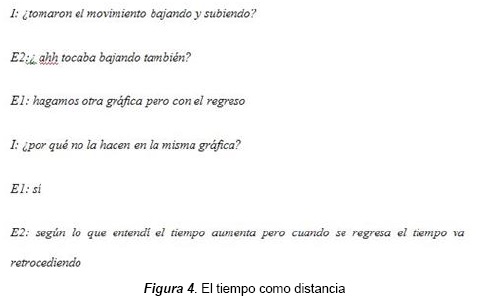 En algunas ocasiones los estudiantes toman el tiempo como si fuera una distancia que puede aumentar y en otras regresar, como se manifiesta en el diálogo realizado por ellos que se muestra en la figura 4.