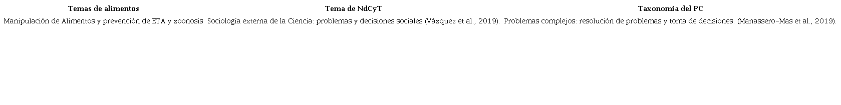 Al relacionar el PC con contenidos de NdCyT y con la prevención de ETA se puede establecer una relación entre la contextualización social de la problemática de las ETA y las herramientas del pensamiento crítico para su prevención (Tabla 1).