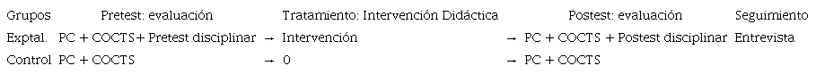 El proyecto CYTRENCRI parte de la hipótesis de que la aplicación en las aulas de diversas SD para el desarrollo del RC del estudiantado contribuirá a superar las dificultades en la enseñanza de la NdCyT. La verificación de la hipótesis se realiza con intervenciones y su comparación entre grupos, mediante pruebas estadísticas. En este sentido, la metodología de esta investigación se ajusta a un diseño longitudinal pretest-intervención-postest, con un grupo de control. La evaluación del estudiantado se realiza mediante tres instrumentos: una prueba de evaluación de RC, el Cuestionario de Opiniones Sobre Ciencia, Tecnología y Sociedad (COCTS) (Manassero et al., 2003) y un cuestionario de entrevista abierta. Además, se incluyeron un pretest y postest en formato de opciones múltiples sobre los contenidos disciplinares. Las preguntas realizadas fueron las mismas para poder comparar las respuestas del estudiantado antes y después de la SD.