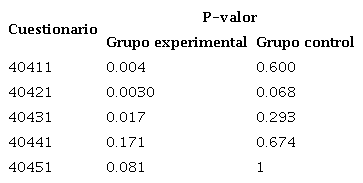 Para el análisis de datos del COCTS se utilizó el programa informático SPSS® (Statistical Package for the Social Sciences, por sus siglas en inglés), aplicando la prueba de los rangos con signo de Wilcoxon con un 95 % de nivel de confianza (a=0,05). La prueba resultó estadísticamente significativa para todos los puntos del grupo experimental, salvo para el punto 40441 (p-valor >0.05), que se relaciona con la posibilidad de engaño hacia las personas que trabajan en CyT. En el grupo control, las pruebas no dieron diferencias significativas entre el pretest y postest establecido para ese grupo. Al no encontrarse diferencias significativas en el grupo control, pero sí en el grupo experimental, podemos pensar que la SD sobre ETA podría ser de utilidad para el abordaje de los problemas sociales como contenido CTS. Los resultados se representan en la Tabla 4.