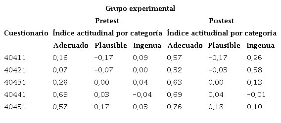 En la primera cuestión del pretest, referida a la influencia de la CyT en los problemas sociales, el índice actitudinal es positivo para las frases adecuadas e ingenuas y negativo para las plausibles. En postest, el índice actitudinal de las adecuadas e ingenuas es mayor al pretest, pero el índice de las plausibles se mantuvo constante. Para las frases aceptables el Δ (poslypre) =0.41, lo cual parece indicar que el estudiantado considera que la CyT resuelven muchos problemas sociales, pero otros no e incluso que la CyT son las causantes de estos. Para las frases ingenuas, el Δ (postypre) =0.17, esto podría significar que parte del estudiantado opina que la CyT empeoran los problemas sociales y es difícil ver cómo pueden ayudar a la sociedad.