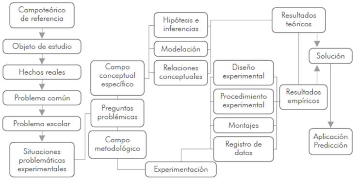 En las prácticas experimentales basadas en resolución de problemas (figura 1) se define inicialmente el cuerpo teórico de referencia, a partir del cual se distingue el objeto de investigación o de estudio en particular, se delimita la realidad a solo aquellos hechos que manifiesten el fenómeno. Con estos hechos se obtiene un primer nivel de acercamiento al objeto de investigación y a partir de ellos se pueden hallar problemas reales o comunes propios de la cotidianidad, cuyo propósito fundamental es resolver algún aspecto concreto de interés social. Los hechos de la vida real constituyen una fuente propicia para formular problemas escolares, de interés académico.